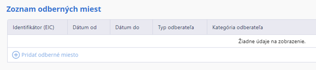 Kliknite na + Pridať odberné miesto, alebo naimportujte podľa priloženého vzoru.